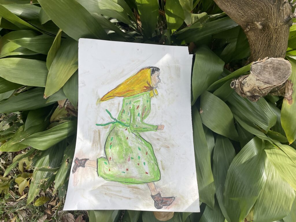 誰かが描いた絵がレモンの木の下に落ちている